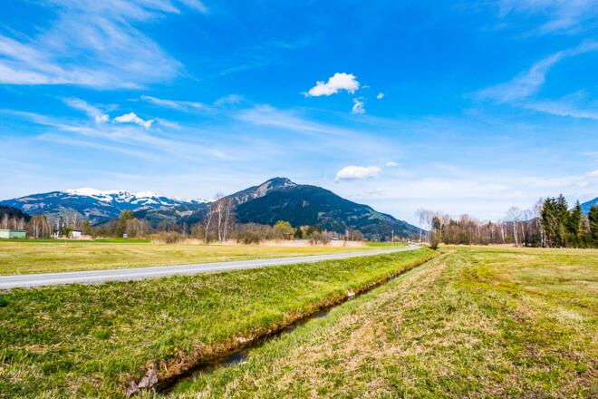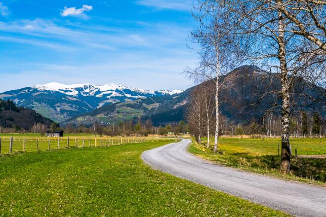 Vom Restaurant Auhof wandert man in Fließrichtung rechts der Kapruner Ache am Bauhof und dem Feurwehrhaus vorbei und biegt dann erneut rechts zum TAUERN SPA Kaprun ein.
