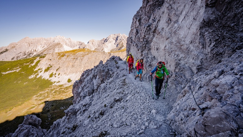 Der Karwendel Höhenweg führt dich durch den südlichen Teil des Karwendelgebirges in Tirol. Einzigartig ist dabei der mehrfache Blickwechsel zwischen der Einsamkeit der Karwendel-Wildnis und dem geschäftigen Treiben im Inntal. Übernachtet wird in handverlesenen Schutzhütten des Alpenvereins, die für dich Besonderes zu bieten haben und durchaus auch zu einer längeren Pause einladen. Der Karwendel Höhenweg ist nichts für alpine Anfänger oder Kinder, sondern richtet sich an erfahrene Bergsteiger, die sich abseits von Trittsicherheit und Schwindelfreiheit, den teilweise langen und schwierigen Etappen, auch konditionell gewappnet fühlen. Die beste Zeit für die Begehung des Karwendel Höhenweges sind die Monate Juli bis September. Vor allem der Spätsommer ist mit seinen stabilen Wetterperioden und exzellenten Fernsichten für eine Begehung sehr zu empfehlen.