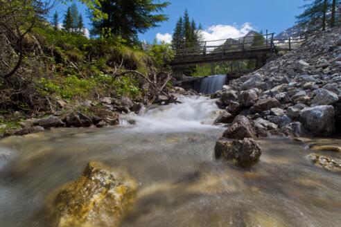 Vom Kasermandl geht es ins Bernhardstal. Ca. 300 m nach der Wildfütterung führt ein Fußweg zum Bach. Nach der Querung der Brücke geht es talauswärts zur Gibleralm (bewirtschaftet). Ein toller Spielplatz erwaretet die kleinen Wanderer.