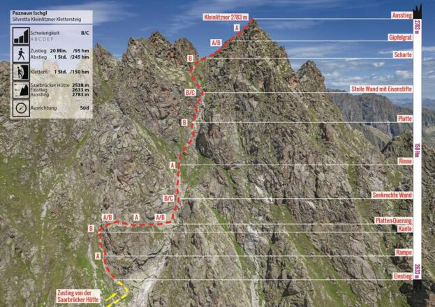 Ausrüstungs-Tipp: Klettersteigset, Helm, Hüftgurt und Handschuhe können gegen eine kleine Gebühr in der Saarbrücker Hütte ausgeliehen werden. Ideal für alle, die über keine eigene Kletterausrüstung verfügen.