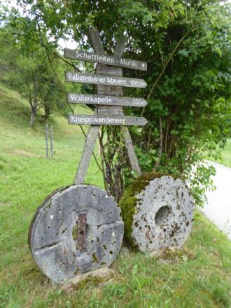 Vom Gasthaus Kleinschönleiten führt der Rundwanderweg (E50) zur Wacholderheide, einer der größten zusammenhängenden Wacholderbestände in OÖ. In Serpentinen erfolgt der Aufstieg durch den Wald auf den Schönleitnerberg, von wo man einen schönen Ausblick auf den Windpark Laussa und den Schieferstein genießen kann. Nach dieser anfänglichen Steigung geht’s gemächlich hinüber zum Naturdenkmal Rebensteiner Mauer. Bei den Kalkfelsen angelangt, mündet der Weg in eine Schotterstraße. Vom Rebensteinbauern geht es die Straße entlang der Rebensteiner Mauer hinunter ins Mühlbachtal, wo man nahe der hochgelegenen Wallerkapelle (erbaut 1854) auf Wohnhäuser trifft. Nach weiteren 10 Gehminuten gelangt man zur alten, restaurierten Hausmühle des oberen Mühlbachtales, der Schattleitenmühle (Besichtigung gegen Anmeldung). Auf der wenig befahrenen Straße geht es weiter zur ehemaligen Taverne, welche schon Flößern und Fuhrleuten zur Einkehr gedient hat. Sie ist leider heute nicht mehr bewirtschaftet, aber ein Rastplatz mit Mühlsteinen und einem Wasserbrunnen lädt zu einer Pause ein. Danach verlässt man das Mühlbachtal linker Hand und wandert auf einem Güterweg Richtung Jochberg. Noch ein kurzer Anstieg durch ein Waldstück bevor man die sagenumwobene Hetzerhöhe erreicht und den Ausblick auf Laussa genießen kann. Das letzte Stück führt über die Schönleiten auf einem etwas steileren Wiesenweg wieder zurück zum Ausgangspunkt.
