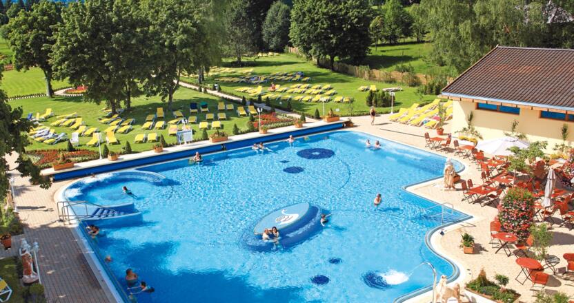 - Becken: Im Innenbereich gibt es drei verschiedene Becken und eine Poolbar. Im Außenbereich, finden Sie ein Außenbecken mit Strömungskanal, ein Thermalsolebecken und ein weiteres Außenbecken, das mit dem Gebirgsmineralwasser befüllt ist.