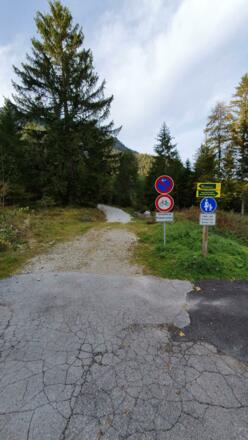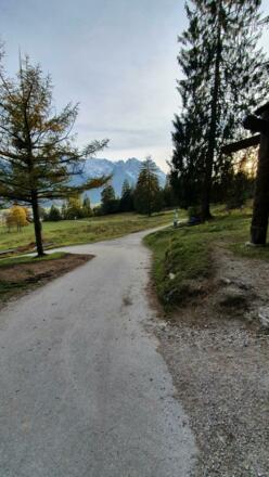 Dein Glück, du biegst nach 150 Meter Bergauf schon rechts auf den Fußweg ab und genießt ab jetzt den Schotter unter deinen Füßen. Auf dem 400 Meter langen Abschnitt geht es leicht Bergauf. Halte dich am Ende der Steigung links in Richtung Almhütte.