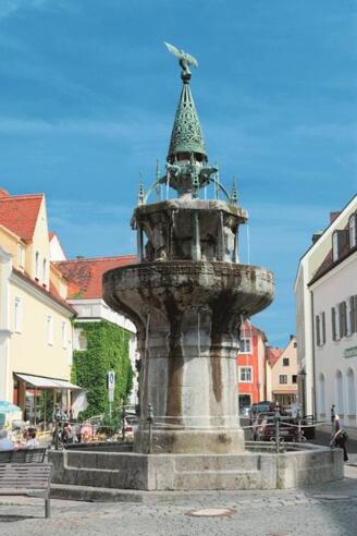 Bereits im Jahre 1480 ist hier ein Brunnen erwähnt - der Ruben- oder Judenbrunnen, der für die Wasserversorgungn der Stadt von großer Bedeutung war. 1902 erfolgte die Errichtung des heutigen Kriegerbrunnens, dessen zum Teil sehr martialisch anmutende Inschriften aus der Entstehungszeit verstanden werden müssen. Am 7. September 1902 wurde der Kriegerbrunnen im Rahmen einer vaterländich und national geprägten Feierstunde eingeweiht. Der von dem Münchner Bildhauer Georg Wrba im Jugendstil entworfene Brunnen erinnert zum einen an die Reichsgründung 1871 und zum anderen an die gefallenen Soldaten des Deutsch-Französischen Krieges 1870/71.
