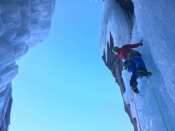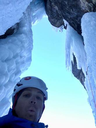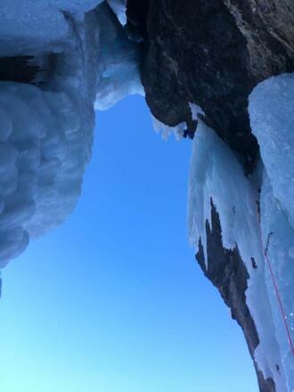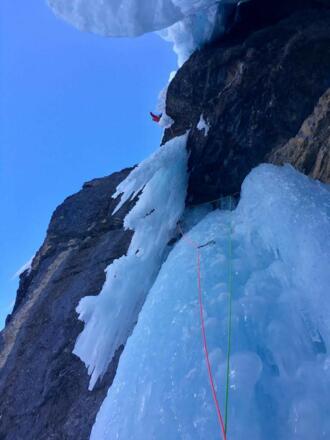 Anspruchsvolle Mixedroute, die oft nass und hinterspült ist. Die Zapfen und Eisbalkone sind einsturzgefährdet.