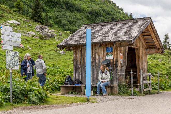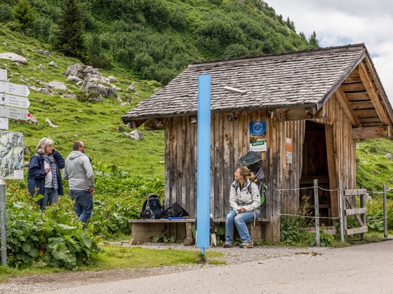 Vom Rüfiplatz ind Lech nehmen wir den Wanderbus zum Formarinsee. Von der Bushaltestelle beim Formarinsee (1871 m) führt ein breiter Weg zur Freiburger Hütte (1918 m, ca. 1 Std. Gehzeit). Von der Freiburger Hütte geht es zunächst über Weideflächen steil ansteigend zum Sattel am Fuß des Formaletsch. Der Weg führt nun als schmaler Pfad durch das Karstgebiet des Steinernen Meers, bevor der Weg über sehr steile Serpentinen hinauf zum Gehrengrat (2438) aufsteigt. Vom höchsten Punkt geht es kurz am Grat entlang, dann steil und zum Teil ausgesetzt ins Dalaaser Schütz hinab und über steile Serpentinen und Bergweiden hinunter zu einer Schützhütte (1974 m) und weiter über Almwiesen zum Spullersee und zur Alpe Dalaaser Staffel. Von der Bushaltestelle am Spulersee oder bei der Alpe Dalaaser Staffel (1746 m) nehmen wir wieder den Wanderbus retour nach Lech.