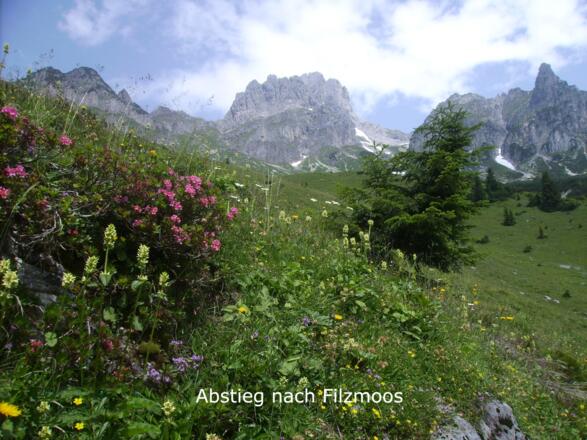 Auf einem Steig mit geringen Höhenunterschieden wandern wir von der Mahdalm zur Sulzkaralm (zuerst gelbes Schild, dann rot-weiß-rote Markierung), von dort weiter auf der Almstraße bis zu einer Kehre, wo die gelbe Beschilderung zunächst zur Hofpürglhütte, beim nächsten Schild auch zur Aualm und nach Filzmoos weist. Wir folgen der Beschilderung bis Filzmoos.