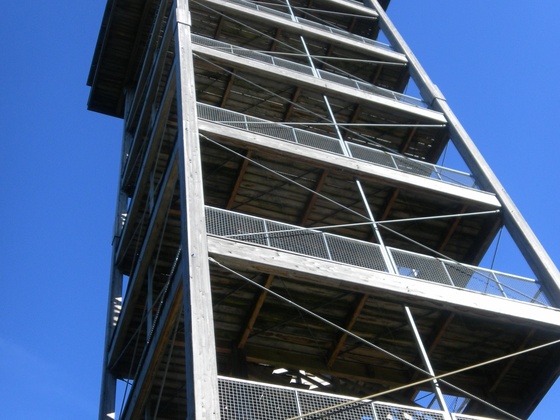 Wir folgen der Forststraße Lichtenberg südwärts. Bei der ersten Linkskurve kann man gerade in den nicht markierten Wanderpfad abzweigen und die lange Rechtskehre der Forststraße abkürzen. Wir überqueren die Forststraße und wandern gerade am Waldrücken auf wurzelig-erdigem Pfad aufwärts. Eine weitere Forststraße wird gequert, danach dem Rücken weiter gefolgt. Wir münden in den Lichtenberg-Rundweg, dem wir folgen können oder wir überqueren den Rundweg und wandern auf Jägerpfaden südwärts weiter. Bald stoßen wir auf einen Karrenweg, der an der höchsten Stelle rechts vorbei zum großen Aussichtsturm führt. Die stabile Holzkonstruktion wird über mehrere Stockwerke auf einer Holztreppe bestiegen.