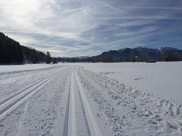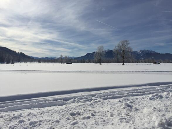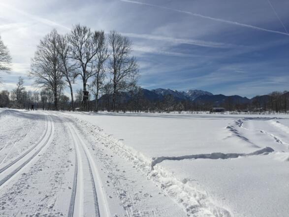 Die Gaißacher Loipe Richtung Lenggries ist von Lehen bis Grundern auch mit einem Langlaufschlitten gut geeignet.