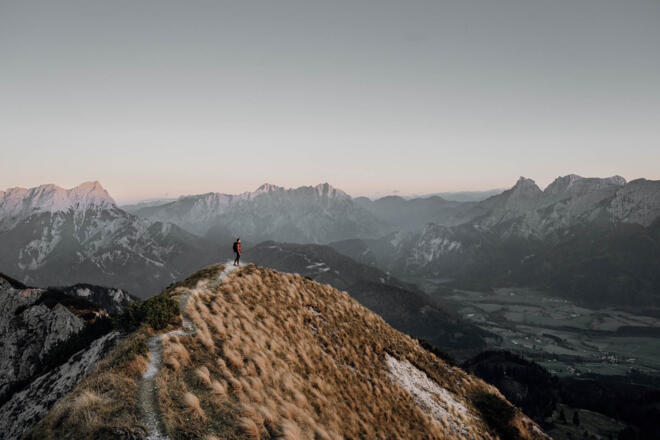- Luchs Trail Etappe 05 Klinkehütte-JohnsbachMit Weitblick: Über den Aussichtsbalkon mit Blick auf die schroffen Gesäuseberge ins Bergsteigerdorf Johnsbach