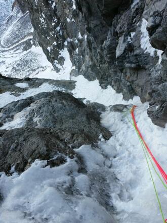 In ca. 6 Seillängen durch das Gully. Im unteren Bereich dominiert abwechslungsreiche Eiskletterei bis WI4+, welche auch gut mit Eisschrauben absicherbar ist. Die Stände sind meist am (im Sinne des Aufstieges) linken Begrenzungsfelsen im Fels untergebracht (Felshaken, fixierte Keile oä.). Im letzten Viertel wird die Route sehr steil, aber das Eis weniger. Hier folgt man der Linie bis unter einen steilen Felsriss, um dann nach rechts über Platten auszuqueren (Mixed oder dry, M6). nach der Querung gute Standmöglichkeit, Danach quert man wieder nach rechts zurück in die Rinne. Über die Rinne (M6) nach oben bis zum Ausstieg in flacherem Gelände. Hier Ende des Gullys. Wer noch den Gipfel macht, stapft die Schneepleise hinauf, zuletzt über den grat auf den Gipfel (3298m Seehöhe).