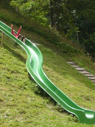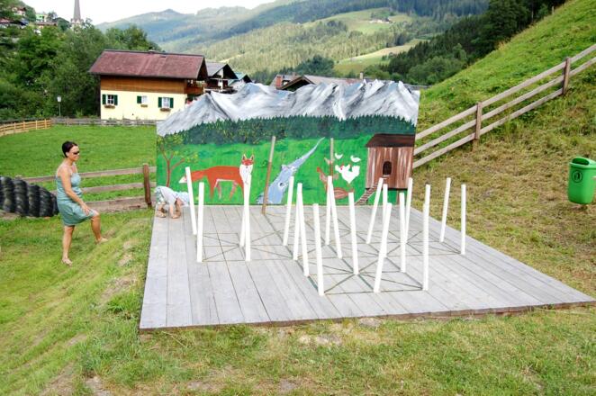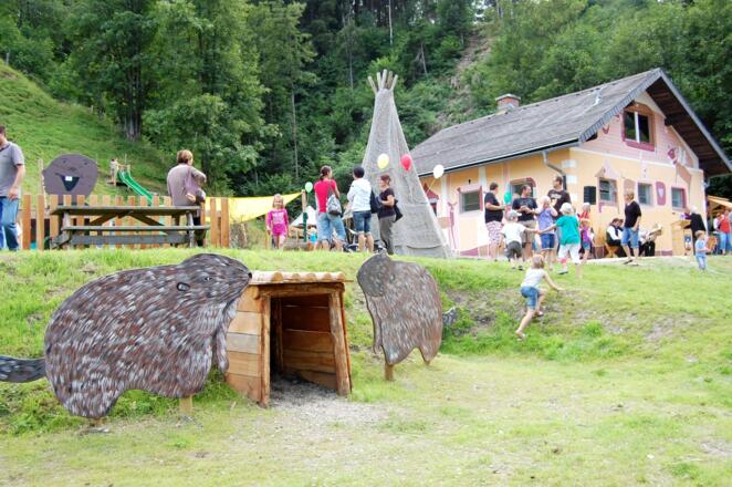 Was es hier alles gibt: einen bekriechbaren Murmeltierbau, Fuchs & Henne Spiel, "Scratch" Wurfspiel mit Tannenzapfen, Seilrutsche, Kletterwand, Hangrutsche, Sandspielplatz, Schaukel, Kneippanlage, Sitzgelegenheiten