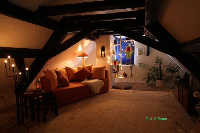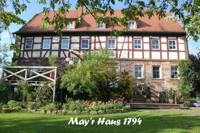 Fachwerkhaus in ruhiger Ortsrandlage, Hochebene zwischen Spessart & Odenwald. Weitläufige Außenanlage, Liegewiese mit Pavillon & Teich, großer Grillplatz mit Laube, Parkplatz, abschließbare Unterstellmöglichkeit für Fahrräder.