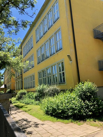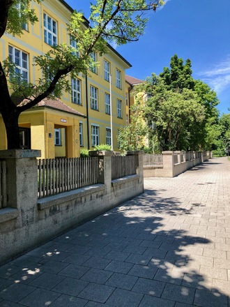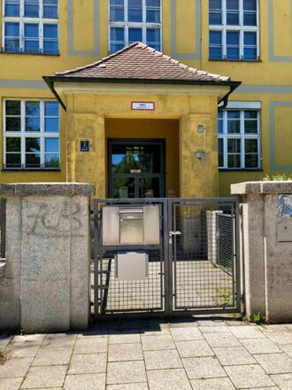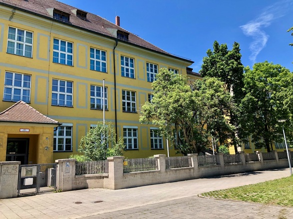 Die "Moosacher Volksschule Leipziger Straße 7" wurde 1900 erbaut und um 1924 erweitert. Die rechte Seite der Schule wurde bei einem Luftangriff 1944 zerstört und 1953-1955 wiederaufgebaut.