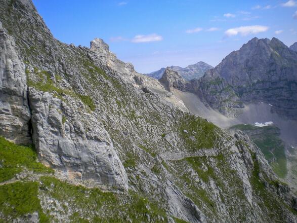 Typisches brüchiges Karwendelgestein. Bei viel Betrieb ist auf Steinschlag durch vorgehende Bersteiger zu achten.
