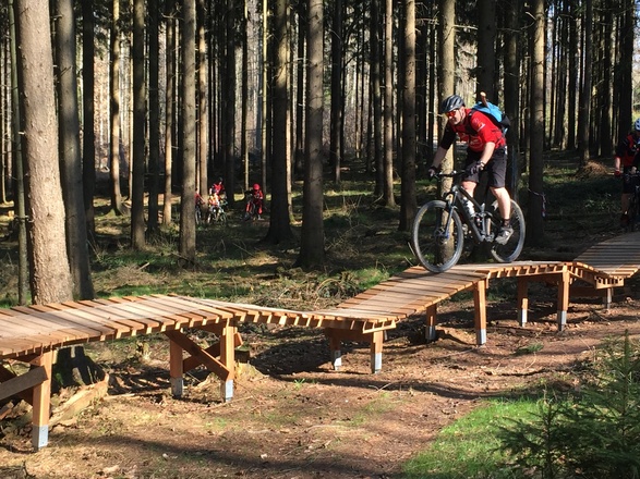 29km bei 920Hm sind zu bewältigen. 60% des Rundkurses verlaufen auf befestigten Wegen, meist um die steilen Auffahrten zu meistern. Die restlichen 40% sind Naturwege und Trails. Was das Herz eines ambitionierten Bikers höher schlagen läßt sind die Abfahrten - steil, schmal, mit Kurven gespickt, vorbei oder über Steinformationen, mit kleinen natürlichen Drops, Anliegern und Brücken schlängeln sich die Trails Richtung Tal.