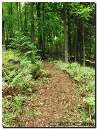 Dieser Abschnitt sollte nur von geübten Mountainbikern in Angriff genommen werden. Alternativ gibt es hier auf Schotterwegen eine leichte Umfahrung. Unten angekommen geht es in einer engen Kehre wieder steil bergauf bis zur nächsten Wegkreuzung. Im weiteren Verlauf folgt die Route dem Schotterweg bis zur Verbindungsstraße Miltenberg-Wenschdorf, führt dann eine zeitlang parallel zur Straße. Nach der Überquerung der Straße biegt die Strecke in eine Uphilltrail -die 'Teutonenschneise' ein. Wieder wird kurz Kondition gefordert. Nach 500m geht es entspannter auf Schotter den Sommerberg hinauf. Oben angekommen kreutzt der Weg kurz nach dem Parkplatz Seboldsruhe den bisherigen Verlauf der Strecke und den Limes. Hier lassen sich kurze Abstecher zu Resten römischer Wachttürme unternehmen. Weiter geht es auf einem befestigten Weg ohne nennenswerte Höhenunterschiede vorbei an alten Steinbrüchen und der Haagsaussicht mit Blick auf das Maintal und den Spessart. Nach knapp 2 km wird es wieder spannend.