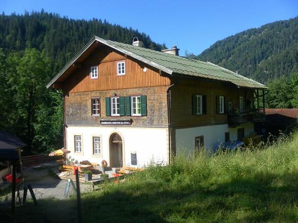 Nach kurzer Rast auf der urigen Alm geht es auf einem kurzen Trail mit ein paar Spitzkehren hinab ins Tal der Bairache und zur Erzherzog-Johann-Klause. Dort biegt man noch Norden ab in Richtung Forsthaus Valepp, von wo aus man bergauf strampelt zur Moni Alm und zum Berggasthof Sutten.