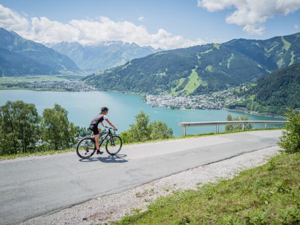 Diese atemberaubende Aussichtstour führt anfangs zum Einfahren flach entlang des Zeller Sees nach Thumersbach. Ab dort geht’s immer auf asphaltiertem Untergrund bergauf zum Mitterberghof.