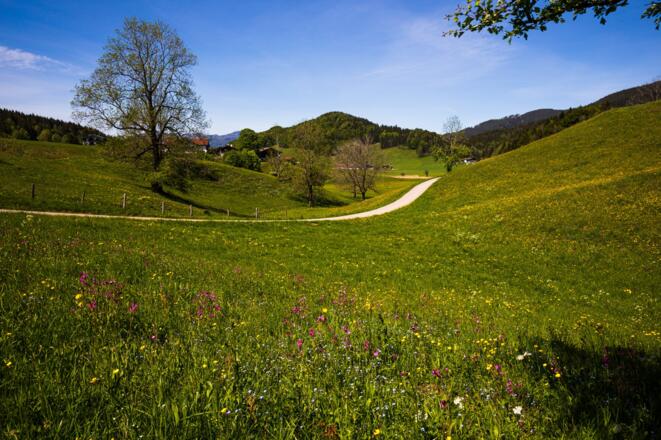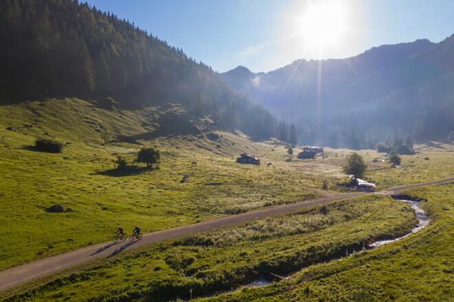 Der Hochfelln (1.664 m) zählt zu den beliebtesten Aussichtsbergen im Chiemgau, für Mountainbiker hält seine Umrundung zwei kernige Anstiege bereit. Auch wenn die Wadeln zwicken bleibt genug Zeit, um die Landschaft zu genießen, etwa die reizvolle Schlucht des Eschelmoosbachs mit seinem Wasserfall, den Weitblick bis zum Chiemsee, oder die historische Triftklause im Naturschutzgebiet Röthelmoos. Auf dem sonnigen, weitläufigen Almboden geht es an einer großen Wegkreuzung mit geschnitzten Holz-Sesseln rechts zur Einkehr an der Langerbauer Alm oder nach links zur Dandl Alm. Wie wäre es mit einem hauseigenen Quarkbrot mit frischen Kräutern und selbstgemachter Limonade?