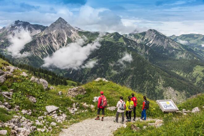 Autofahrt nach Tannheim - Liftparkplatz. Links vor dem Lift gehts hoch zum Wiesenweg nach Schmieden, dann links den Wanderweg hoch bis zur Usseralpe. Aufstieg weiter über die Gundhütte zum Neunerköpfle Gipfel. Wir genießen die herrliche Aussicht und tragen uns im größten Gipfelbuch der Alpen ein. Abstieg zur Gundhütte und nachder Brotzeit mit der Gondelbahn ins Tal. Der Erlebnisweg rund ums Neunerköpfle ist auch für Kinder zu empfehlen, Glockenspiel verschiedene Info Tafeln über Blumen und Tiere.