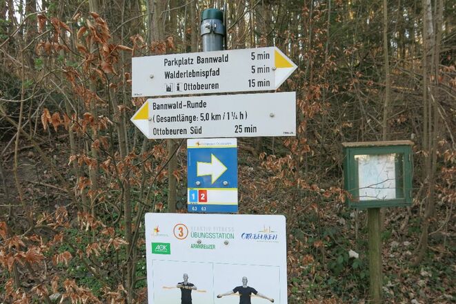 Startpunkt ist der Wanderparkplatz am Bannwald. Der mit „Bannwald-Runde“ ausgeschilderte Weg führt in südlicher Richtung am Waldrand entlang. Linkerhand kommt bald der Kneipp-Aktiv-Park in den Blick und wir spazieren am Hotel St. Ulrich und am Parkhotel Maximilian vorbei. Der Weg führt leicht bergauf bis wir eine Viehweide queren. Nun gilt es die Straße zu überqueren. Hier ist etwas Vorsicht geboten. Der weitere Weg führt leicht bergab zur „Fuchsfarm“, dem heutigen Vereinsheim der Ottobeurer Pfadfinder. Auf der Strecke kann man sich an einem Kneipp-Tretbecken erfrischen. Anschließend folgt die einzige Steigung der Rundwanderung. Immer bergauf geht es erst durch den Nadelwald und dann durch den schönen Laubwald. Bei der Straßenüberquerung ist wieder Vorsicht geboten. Nachdem man die Treppen überwunden hat, steht man hoch über Ottobeuren. An einem Flurkreuz findet sich ein schönes Aussichtsbänkchen. Wir folgen jedoch dem Weg in die andere Richtung in Richtung der Allgäuer Volkssternwarte (Führungen jeden Freitagabend ab 19:30 Uhr bei jedem Wetter). Auf der Anhöhe spazieren wir wieder in den Bannwald. Es geht bergab und weiter auf dem Weg entlang des Motzabächles zurück zum Parkplatz.