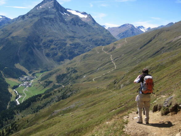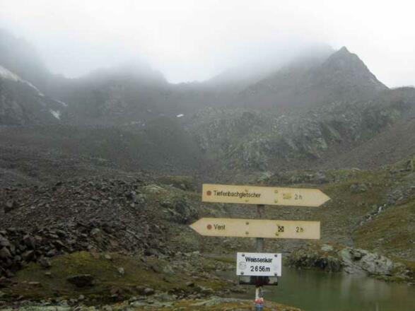 Beginn am Parkplatz des Tiefenbachgletschers. Nach einem kurzen Anstieg von ca. fünf Minuten zweigt der Wanderweg ab. Dieser Weg kann von jedem trittsicheren Bergwanderer begangen werden. Der Wanderweg führt nun leicht fallend, die Hänge des Seiterkares querend, hinüber zum Mutboden, der nach einem kurzen Anstieg zwischen einen Felsriegel erreicht wird. Weiter geht es hinein in das Weißkar, wo für Stempelsammler ein Stempel wartet. Vom Weißkar aus nun weiter über einen Moränenrücken hinunter bis ca. 2.550 m, von wo aus der Weg fast höhenlinienparallel die steilen Südhänge des Weißkopfkogels quert. Nach dieser Querung geht es über in sanftere Hänge. Keine Unterstehmöglichkeit und kein Restaurant unterwegs.