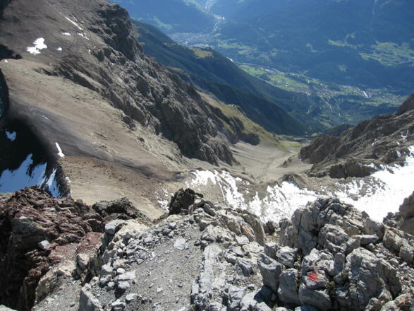 Feste Bergschuhe und Helm; Wetterfeste Kleidung.
