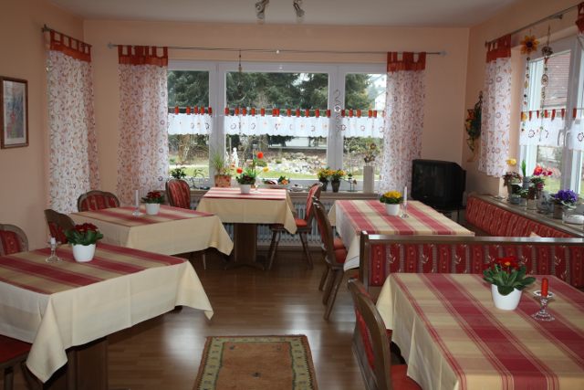 In einem gemütlichen, hellen Gastraum können Sie ein reichhaltiges, gutes Frühstück genießen.