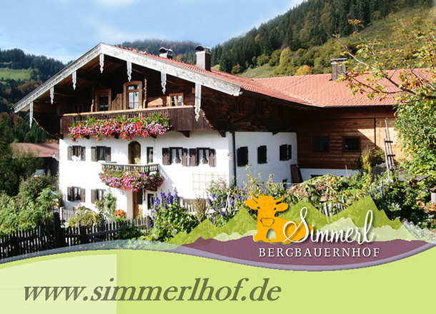 Oberhalb von Sachrang auf knapp 900 m trohnt der Simmerl-Bergbauernhof, ruhig und sonnig inmitten der Chiemgauer Berge. Genießen Sie den herrlichen Blick auf das Bergmassiv des "Zahmen Kaisers" und zur Wildbichlalm.