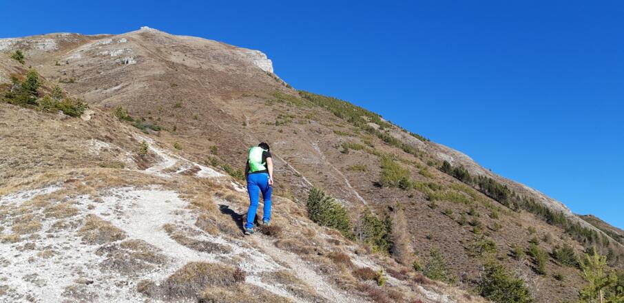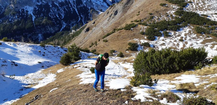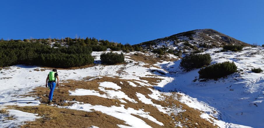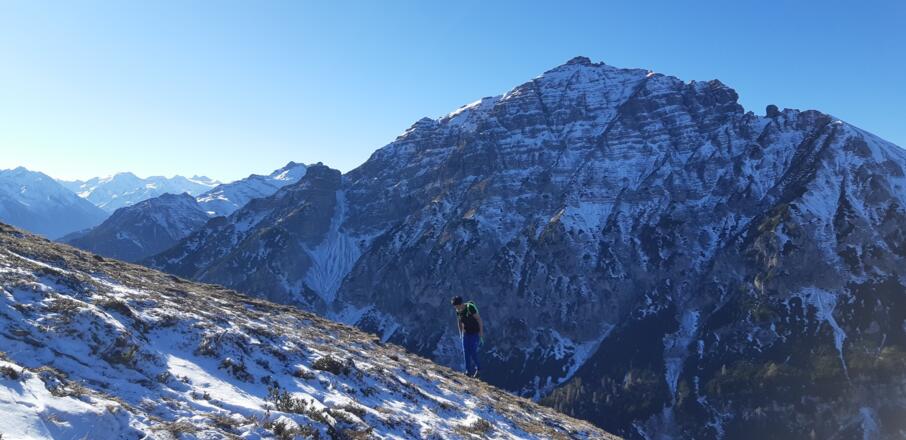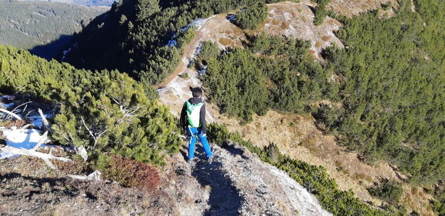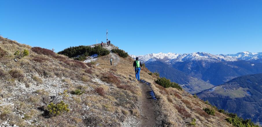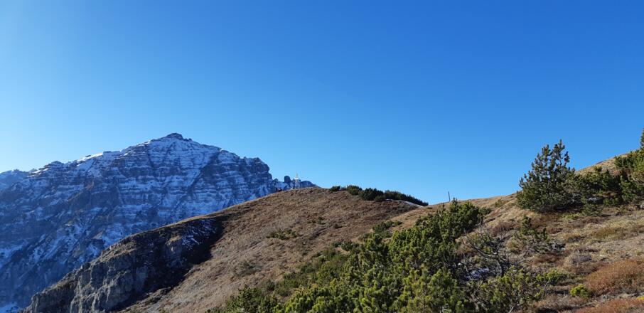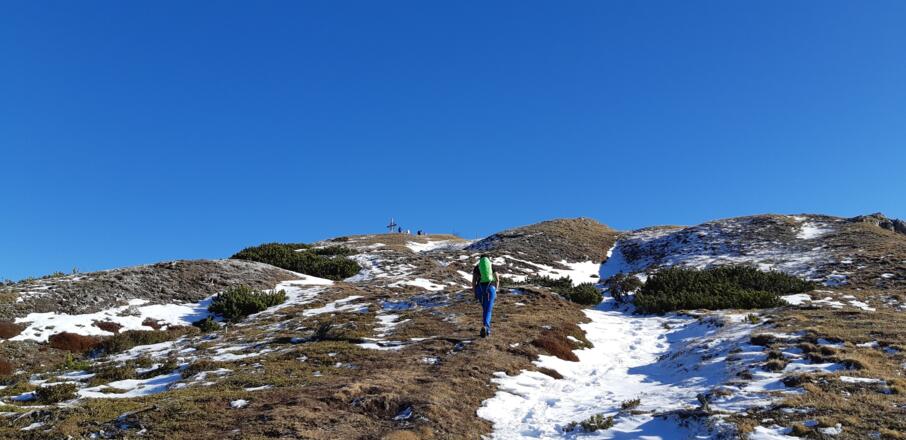 Vom Gipfel wenden wir uns nach Osten. Ein etwas steilerer Abstieg führt uns in eine Scharte und von dort in wenigen Minuten zum Gipfelkreuz des Jochkreuz.