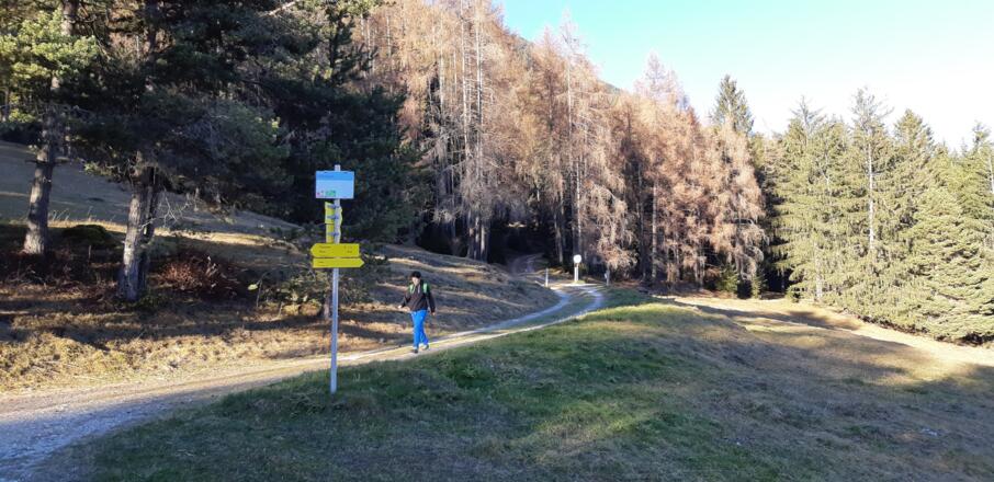 Abstieg: weiter geht es Richtung Osten zum Wegkreuz "Mittlat Isse" und über schönes Almgelände zu einem Schilderbaum, der uns den Weiterweg zum Parkplatz nach Telfes Kapfers weist