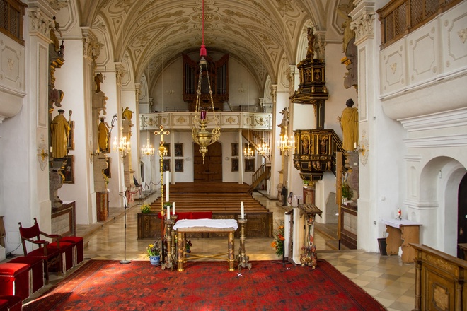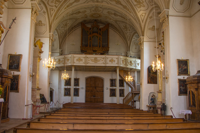 Ehemaliges Chorherrenstift mit bemerkenswertem Hochaltar mit Figuren Kaiser Heinrichs und Sigismunds von Ambros Degler. Markante Turmlösung.