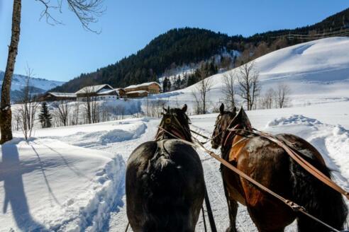 Eine wunderschöne Pferdeschllittenfahrt durch den verschneiten Wald von Maria Alm darf in keinem Winterurlaub fehlen.
