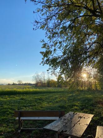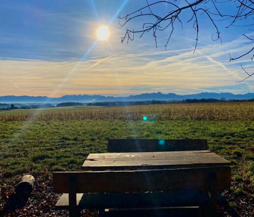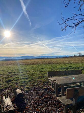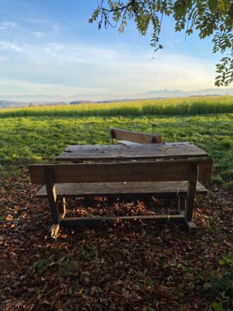 Picknickplatz, mit Blick auf die Alpen, lädt zum Verweilen und Genießen ein.