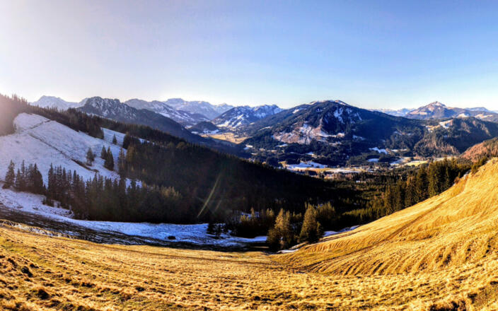 Zum Abstieg kann man entweder den gleichen Weg bis zur Alpe zurückgehen oder man nimmt den Sommerweg südlich bis zu den Bäumen, dann links hinunter an der Kante entlang (Achtung nicht in den lawinengefährdeten Hang gehen) bis auf 1475m. Ab hier findet man rechts ein Weglein, das sich zu einem Wirtschaftsweg entwickelt und ebenfalls zur Alpe führt.