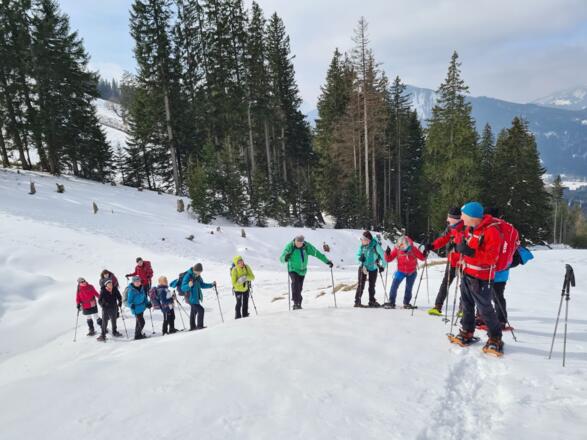 Am Parkplatz klemmen wir unsere Schneeschuhe unter den Arm und wandern ca. 200m auf der Hauptstraße zurück und biegen beim Mühlbach das Strässchen nach rechts ab und legen kurz vor den ersten Häusern von Giessenschwand unsere Schneeschuhe an. Ab hier geht es erst unter ein paar Bäumen hindurch über einen freien Hang hinauf zum Weg und von Wegweisern geführt über die " Obere Alpe Reuterwanne" zum Gipfel der Reuterwanne.