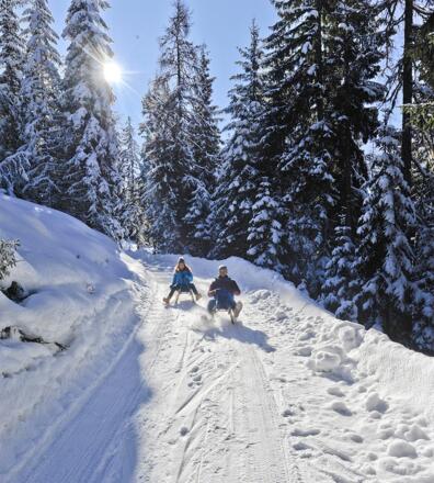 Von der Sonnalm führt der Rodelweg durch den tief verschneiten Nadelwald in Serpentinen hinab ins Hoteldorf Zauchensee auf 1.350 m. Eine sanfte Strecke mit gleichbleibendem Gefälle.