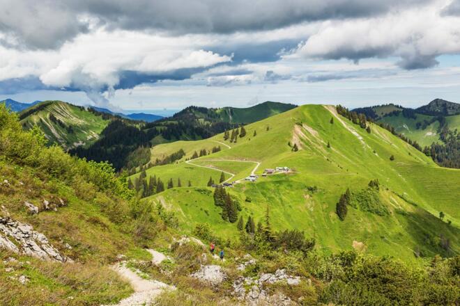 Direkt links hinter der Hütte geht der Weg weiter zur Tegernseer Hütte und zum Ross- und Buchstein. In einem leichten Rechtsbogen geht es wieder etwas flacher um den Gipfelaufbau herum und am nächsten Wegweiser links zur Tegernseer Hütte. Die letzten Meter führen uns über etwas steilere Serpentinen bis auf die Hütten-Terrasse, zwischen Ross- und Buchstein. Über die Terrasse nach rechts hinüber zu Gipfelgrat des Rossstein und über einen kleinen Steig hinauf zum aussichtsreichen Gipfel.