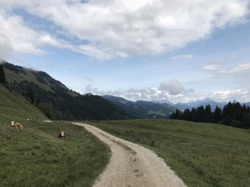 3.00 km – An der Einmündung zum Hauptweg biegen sie RECHTS AB (Richtung Kössen) und folgen diesem Weg ins Tal.