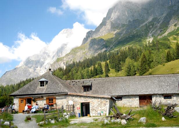 Die erste Etappe des Salzburger Almenweges startet in Pfarrwerfen: Vom Ortszentrum bzw. der ÖBB-Haltstelle geht es erst über die Salzach, dann ein kurzes Stück in Richtung Norden bis zur Abzweigung „Reitsamerhof“. Hinter dem Gasthof führt eine steile Zufahrtsstraße zum Schwabegg, von dem sich ein herrlicher Ausblick auf das Tennengebirge eröffnet. Nun folgt ein einfacher, rund 5 Kilometer langer Abschnitt ohne nennenswerte Steigungen durch das schattige Höllntal und vorbei am ehemaligen Gasthof Hölln. Kurz vor dem idyllischen Jagdhaus zweigt der Weg links ab hinauf zur Grünmaißalm. Ein paar hundert Meter davor lässt man den Wald hinter sich und es bietet sich ein schöner Ausblick auf den imposanten Hochthron am Tennengebirge auf der gegenüberliegenden Salzachtalseite. Bei der Alm endet die Forststraße und die Wanderung führt auf einem etwas oberhalb beginnenden Steig weiter.
