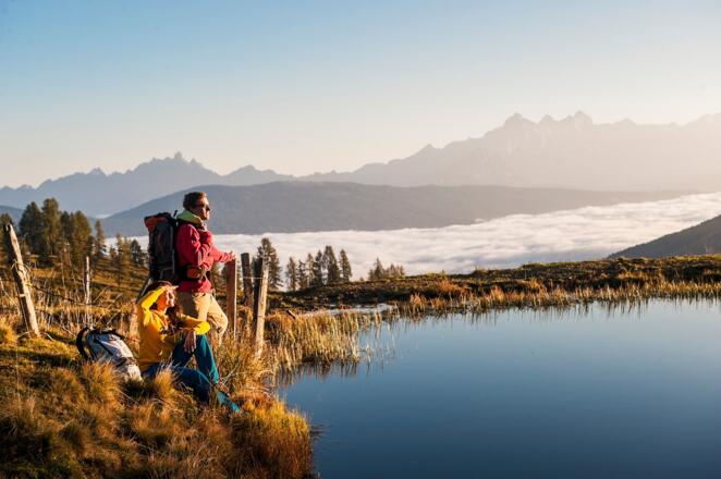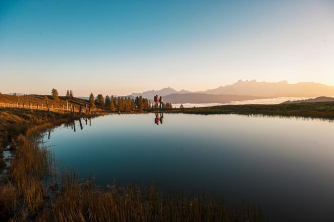 Die Lackenalmen verdanken ihren Namen den dunklen, moorigen Lacken, die von den Einheimischen auch Himmelsteiche genannt werden. Sie speisen sich rein aus Regenwasser und sind wichtig für die Versorgung der Weidetiere. Wer gut in der Zeit liegt, sollte sich ein kleines Päuschen am Wasser gönnen, in dem sich der Himmel mit seinen dahinziehenden Wolkenbildern spiegelt. Zum Baden eignet sich hingegen der Zauchensee am Etappenziel. Mit einer Wassertemperatur von 16 bis 18 Grad im Sommer ist er ein wahrer Frische-Kick!