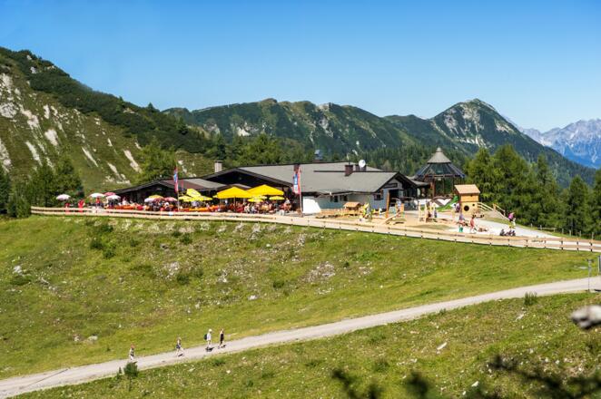 Vom Etappenstart – dem Alpengasthof Kogelalm – führt der Salzburger Almenweg erst einmal stramm bergab nach Flachau. Wer den Abstieg entlang der sommerlichen Skipisten nicht zu Fuß zurücklegen oder Zeit einsparen möchte, nimmt den Lift ins Tal: Die Bergbahnen „Starjet 1+2“ fahren von Pfingsten bis Anfang Oktober täglich ab 9 Uhr früh. Im Ortszentrum von Flachau können sich Wanderer gut an der Kirche Maria Empfängnis orientieren. Der Salzburger Almenweg führt direkt an ihr vorbei, weiter über die Autobahn und von dort einem Teilstück des „Weges der guten Wünsche“ folgend bis zum Wechselmaisweg. Diesen querend führt der Weg mäßig steil bergauf durch den Wald und danach entlang der Forststraße bis zum Berggasthof Sattelbauer, der von Flachau in gut einer Gehstunde erreicht ist.