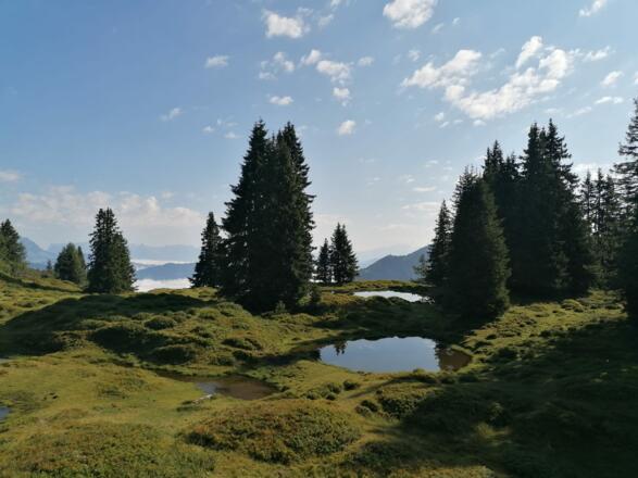 Für jene, die auf Etappe 4 des Salzburger Almenweges nicht ins Tal wollen bildet die Etappe 4a eine gute Alternative. Von der Kögerlalm geht es nicht wie bei Etappe 4 beschrieben ins Tal sondern ab der Drei-Waller-Kapelle rechts hinauf Richtung Heinreichalm. Auf einem Waldweg gehts es dann an der Abzweigung Richtung Rauchkögerl linkerhand Richtung Bernkogel. Unterhalb des Gipfels des Rauchkögerl geht es links an einem Hochmoor vorbei weiter Richtung Süden. Auf diesem Höhenrücken verbleibend, vorbei an einigen weiteren kleinen Teichen und Mooren erreicht man das Hahnbalzköpfl. Gering ansteigend führt der Weg zum höhchsten Punkt dieser Etappe, wo das Papernig-Kreuz mit herrlichem Ausblick zum Verweilen einlädt, bevor man über einen Pfad vorbei an Moränen den Abstieg antritt. Nach weiteren 150 m Richtung Bernkofel zweigt der Weg nach links ab und führt seitlich des vom Bernkogel herabzeihenden Schuttkegels in Richtung Amoser Hochalm bis zu einem Güterweg hinunter. Oberhalb der Amoser Hochalm – am Fuße des Bernkogels beginnt der Bettlersteig, ein alter Verbindungsweg, bis zur Heinreichalm. Diese bewirtschaftete Almhütte ist das Zwischenziel und die heutige Übernachtungsmöglichkeit der Etappe 4a.