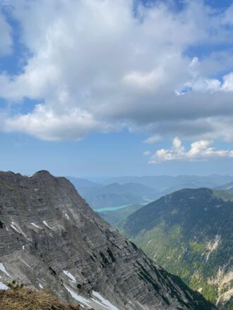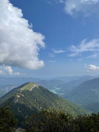 Vom Gipfel hat man einen traumhaften 360-Grad-Blick zum Sylvensteinspeicher, in Richtung Norden ins Alpenvorland und ins Karwendelgebirge.