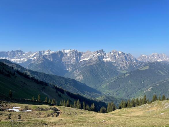Nach dem kurzen, aber steilen Anstieg von der Hütte weg ist bei der eher flachen Querung im Frühjahr/Frühsommer unbedingt Abstand zu halten von den großen Schneewechten am Grat.