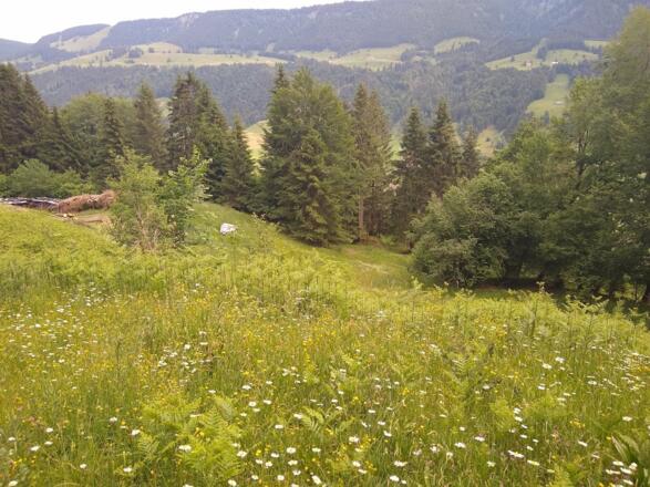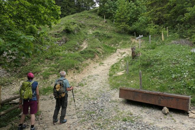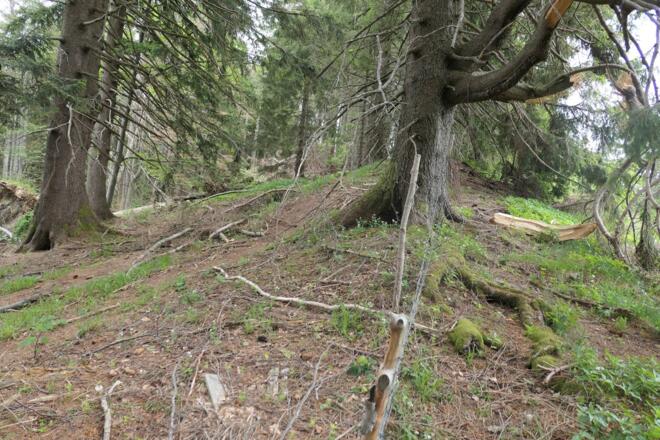 Nach der verdienten Brotzeit und herrlichen Aussicht brechen wir zu unserem eigentlichen Abenteuer auf: zu unserer Suche nach der Höhle. Dazu wandern wir ein Stück westlich auf unserem Aufstiegsweg zurück und zweigen bei den ersten Bäumen rechts ab. Wir peilen den Höhenweg an, wandern ca. 20 min auf ihm und zweigen auf Höhe 1175m bei dem Punkt ab, wo der Zaun aufhört bzw. einen 90° Winkel macht. Hier kriechen wir unterm Zaun durch, kommen auf eine steile Wiese und queren diese in südöstlicher Richtung hinunter bis zum nächsten Zaun auf 1110m Höhe.