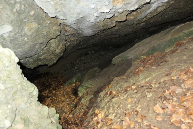 Hier finden wir einen aufgelassenen Hirtenpfad, der uns zur Burgangeralpe führt. Achtung: bei Nässe ziemlich schmozig. Kurz vor der Alpe kommen wir auf die Zufahrtsstraße, der wir nach rechts hinab folgen. Schon 40m nach dem Gatter sieht man mit etwas Aufmerksamkeit einen kleinen Trampelpfad, der uns zu einem breiten Graben und in 2 min zu der rechts am Felsrand befindlichen Höhle führt.