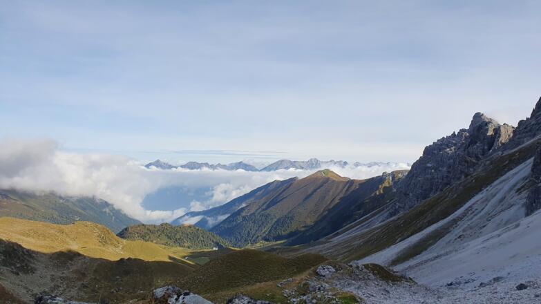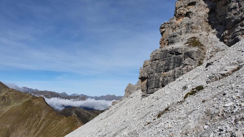 Brüchiges, ausgesetztes Gelände in dem nicht immer perfekt abgesichert werden kann. Auch der Abstieg bietet nochmal einige absturzgefährdete Stellen.