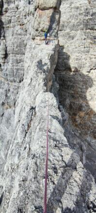 2. SL: Einige Meter absteigen (I-II) dann unschwierig auf einem Band queren bevor es wieder hinauf auf den Grat geht (II+). Nun ein über ein Band zu einem einzementierten Haken. Hier Stand und anschließen ca. 15 m abseilen.